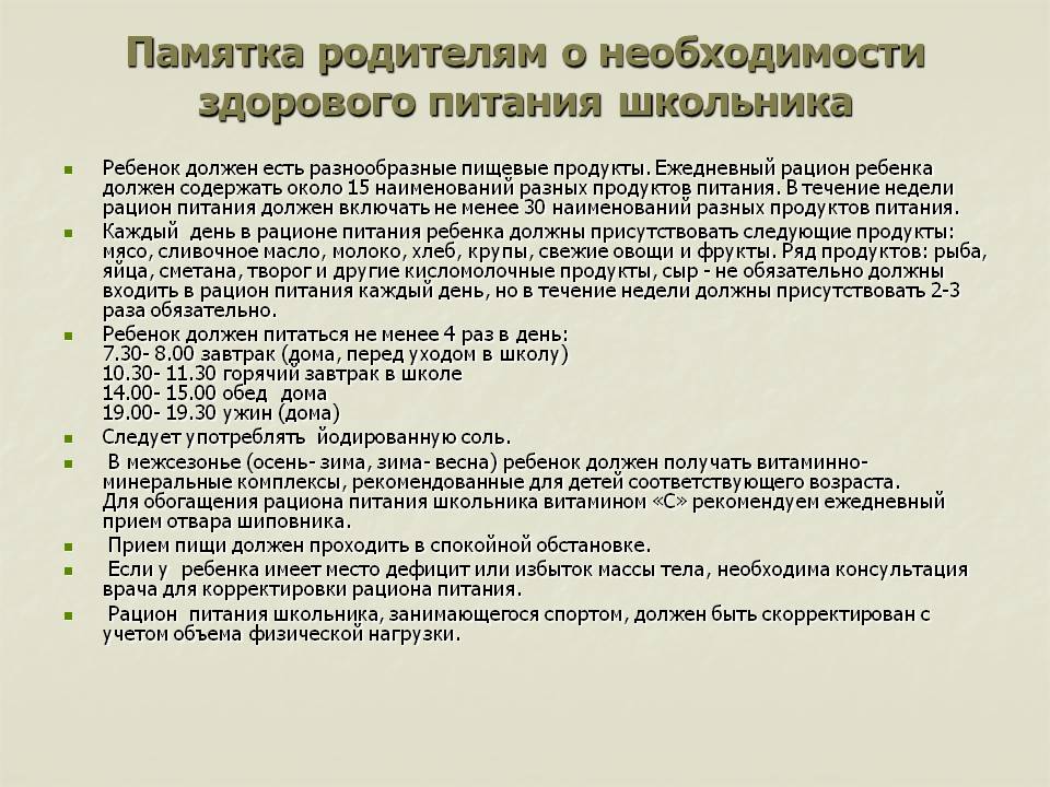 Обед состоит из первого, второго и третьего блюда (напитка). В обед обязательно включается горячее первое блюдо, второе – мясное или рыбное блюдо с гарниром (крупяным, овощным, комбинированным).